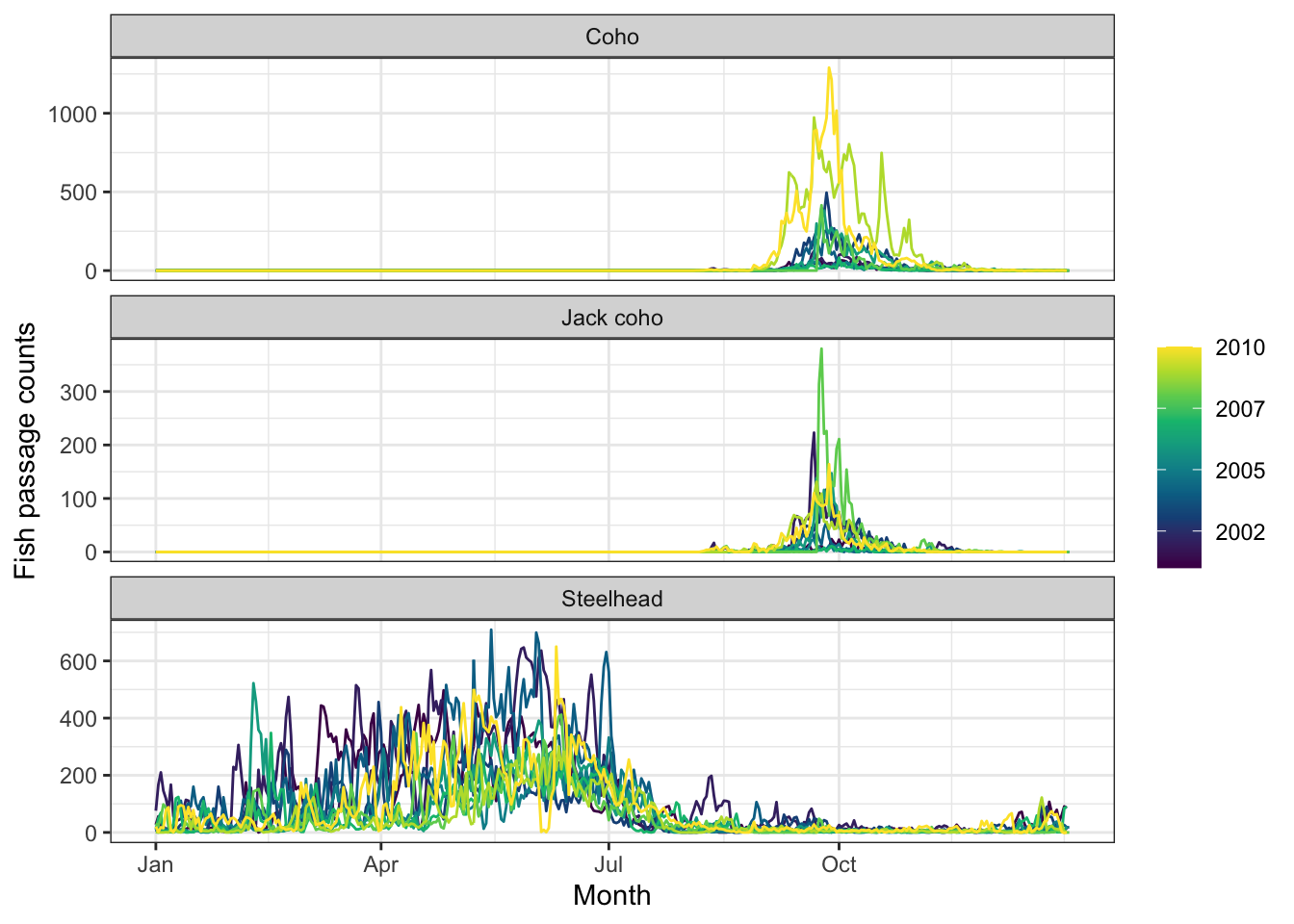 Assessing temporal patterns of coho salmon and steelhead trout migration