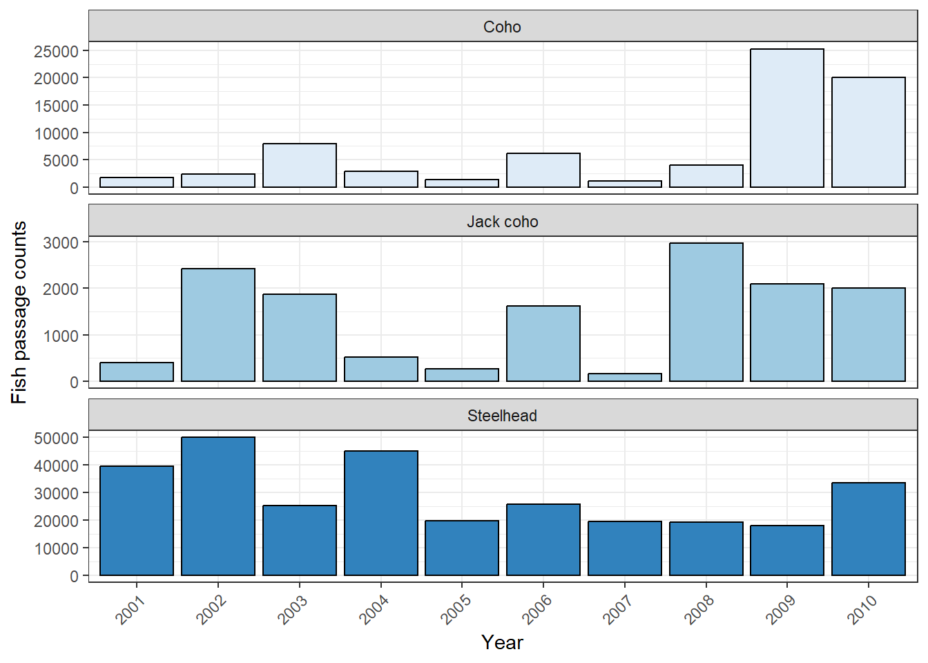 labs(x = "Year", y = "Fish passage counts")