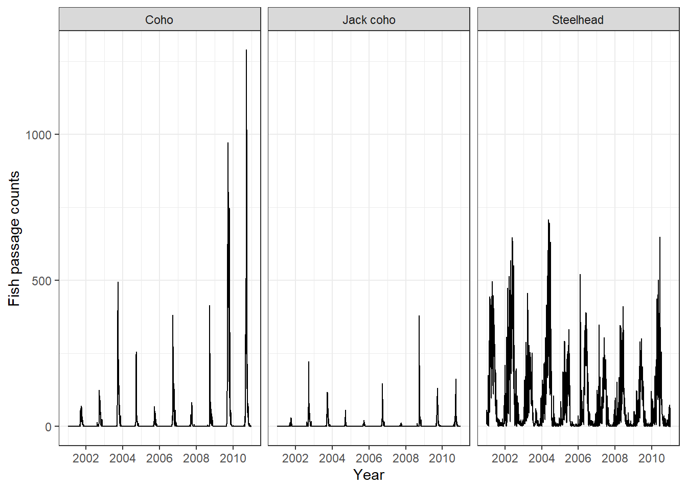 fish_ts_0 <- replace(fish_ts, is.na(fish_ts), 0) #replace NAs with 0passage_plot <- ggplot(fish_ts_0,